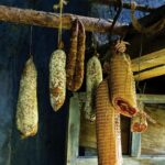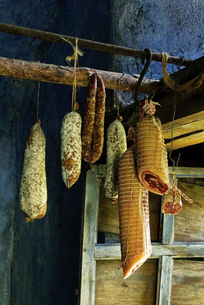 Inoltrandoci nella cantina, ci soffermiamo a osservare lo slancio verticale dei salumi. Da qui nasce l’idea del servizio fotografico, dei supporti cartacei e dei tagli grafici inaspettati. Usiamo la cantina così com’è...